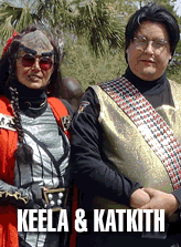 |  Keela & Katkith Keela & Katkith's Klingon Karaoke Keela & Katkith's Klingon Karaoke has been going strong since November 2002. They are regular fixtures at StellarCon and ConCarolinas in North Carolina with performances Friday and Saturday nights, to the delight of con attendees. In 2005, Keela & Katkith debuted their Klingon Karaoke at TrekTrak in Atlanta to an enormously enthusiastic audience and are excited to again return in 2009 for their fifth year. Female audience members will be delighted to know that K'Blahm, the Klingon jester, and his sidekick, KaBlooey, also return this year to assist! All the songs are in the huMan tongue, as normal karaoke is; it's just that the venue is karaoke with a Klingon twist. Worried the song you want to sing is not in Keela & Katkith's Klingon Karaoke collection? Bring your own CD! TODAY is a GOOD day to SING! | ||